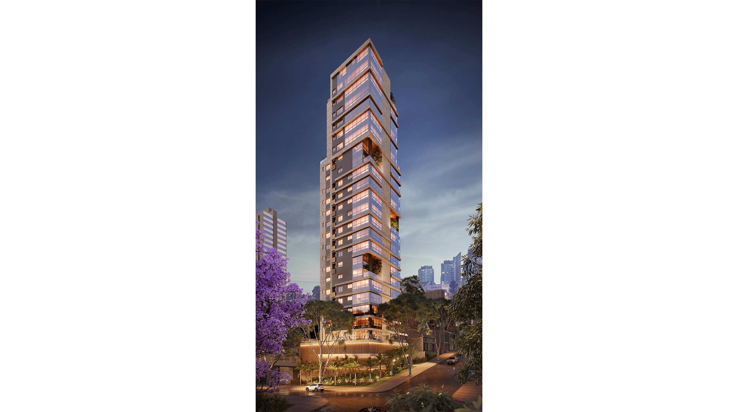 Sua fachada mistura revestimentos nobres, como Granito Soft Yellow e painéis ripados, revelando desde o primeiro olhar o equilíbrio entre presença e discrição.